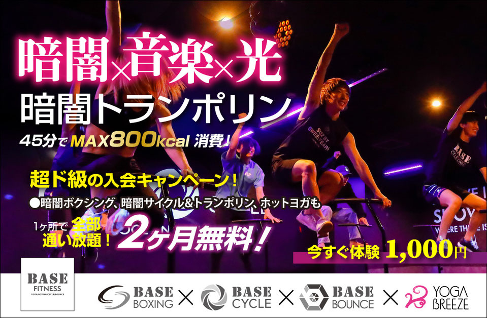 平日10時~18時までに開催されるベースサイクル、ベースボクシング、ベースバウンス(トランポリン)、ヨガブリーズが月4回通えます。 |